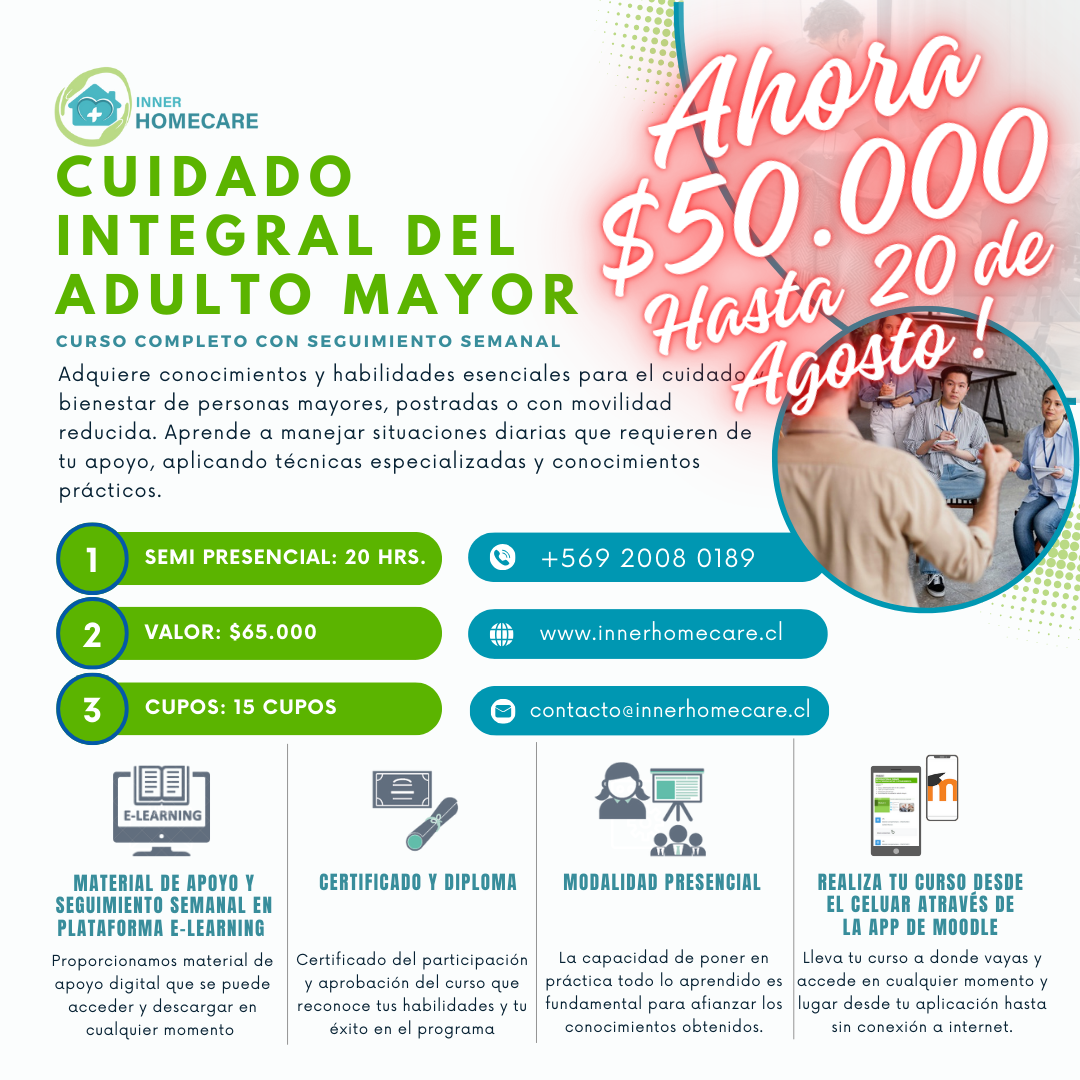 Además, ofrecemos nuestro curso especializado en el cuidado de adultos mayores en casa. Este curso está diseñado para capacitar a cuidadores familiares, enfermeras, TENS y profesionales de la salud, proporcionándoles las herramientas necesarias para enfrentar los desafíos del cuidado diario de los adultos mayores.
